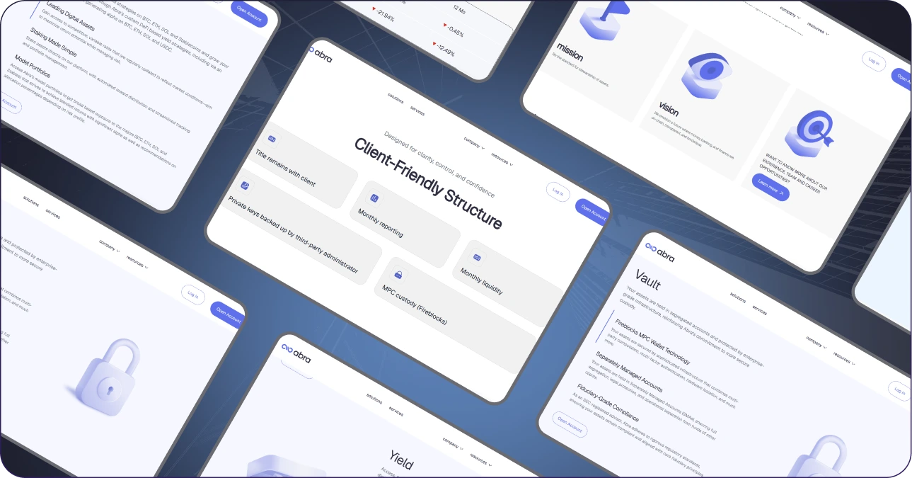 Abra is an SEC-registered crypto wealth management platform serving institutions and HNWIs with custody, yield, and collateralized loans. We rebuilt their client portal from scratch — including the loan calculator, collateral monitoring dashboard, yield strategy interface, and API integrations with Fireblocks custody. The new platform handles $484M+ in AUM with real-time portfolio tracking and institutional-grade reporting.